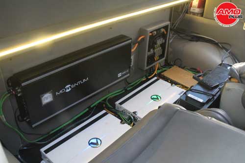 Untuk reproduksi nada rendah, maka juga terpasang dua unit driver subwoofer Momentum seri CX2DD, dimana sebagai penguat dayanya juga disiapkan sebuah power amplifier monoblok Momentum MX 5000.1. Dan seluruh penempatan speaker belakang memang dirancang dengan seluruh driver menghadap ke arah belakang dengan mengorbankan area kabin belakang. Untuk memenuhi seluruh kelistrikan pada sistem audio ini telah disiapkan sebuah aki tower dengan kapasitas 100 Ampere.