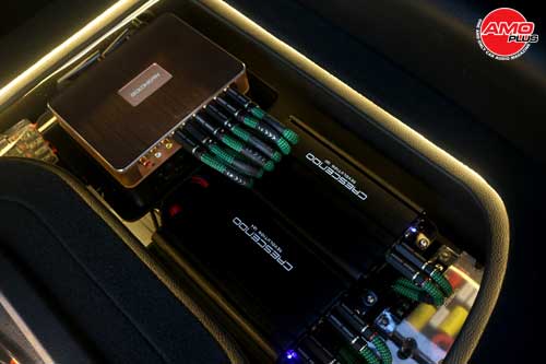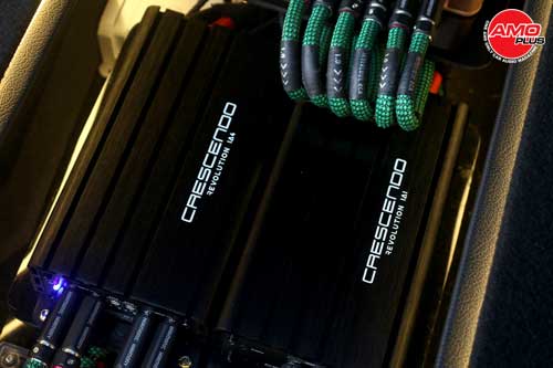 Untuk penguat daya dari jajaran speaker di atas menggunakan amplifier Crescendo Revolution 1A4. yang merupakan jenis power amplifier 4 channel kelas AB dengan daya keluaran sedang. Amplifier ini memang khusus untuk menghandel speaker Crescendo Revolution 1S2. Sedangkan untuk konsumsi subwoofer Crescendo Revolution 110, maka telah disiapkan power amplifier monoblok Crescendo Revolution 1A1. Bagian lain yang tidak kalah penting adalah perkabelannya menggunakan produk besutan Harmonic Harmony serta produk dari Octave.